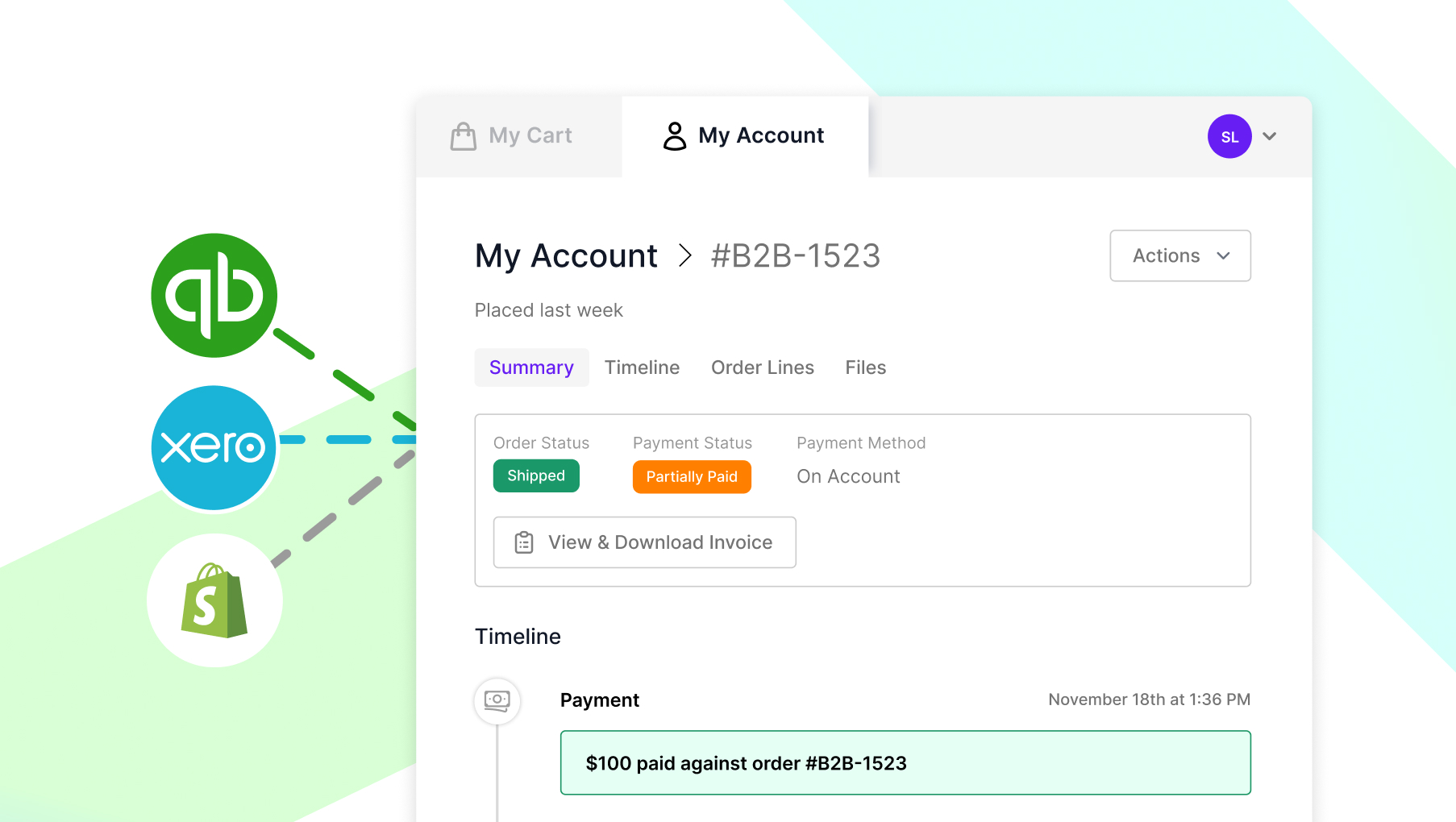 Connect your B2B orders with invoicing and payment data from Xero, QuickBooks, and Shopify. Automatically create invoices, sync payment status, and give customers real-time visibility of what’s paid and what’s owed - directly inside SparkLayer.
