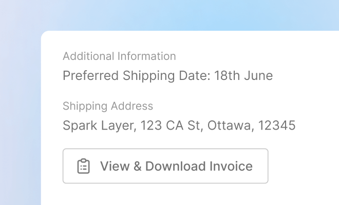 Customers can view and download invoices, see payment history, and check outstanding balances directly inside their SparkLayer account. This improves transparency and reduces back-and-forth between customers, sales teams, and finance teams.